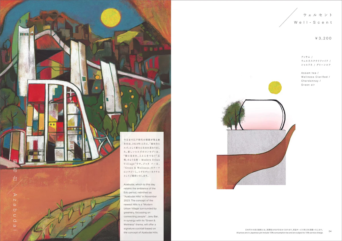 2024年3月に麻布台ヒルズにオープンしたラグジュアリーホテル JANU TOKYO内に併設する「JANU Bar」オリジナルメニューのイラストを担当しました。 カクテル開発はミクソロジストの南雲 主于三 氏の監修。 東京の街8ヶ所をテーマにしたカクテルを、アート性の高い抽象的なイラストで表現することで、創造力を刺激しながら楽しめるオリジナルメニューとなっています。